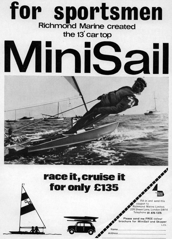 Alright, here's a cheesy advert from Feb 1969 for the Minisail to bring us back on topic: Must have been difficult to persuade people it was a serious racing class after that! Much like the car advertising of the day. Note the totally inadequate boom and kicker and imagine what happened when he eased to mainsheet to try to go for a blinding reach! But OK, the racers did improve on things, and a friend tells me that when he sailed a Fireball, the Minisails could keep up on a reach. Edit: note the Design Centre label. I recall seeing a Minisail in the Design Centre when it had a showroom/gallery in central London. Edited by Medway Maniac |