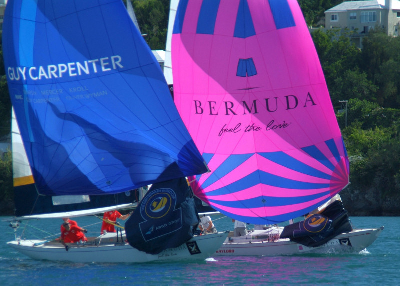 Racing today was delayed for an hour awaiting the easterly breeze to fill fully in Hamilton harbour, but once in it developed into a pleasant 8-10 knots, perfect for match race sailing. Shifts and puffs were still determining factors in many matches, however, so like in the three earlier days in this competition the leaders were rarely safe without having substantial margins over their rivals, and the action was often quite close in all four pairs.