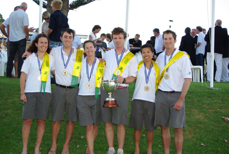 Team USA 1 of the New York Yacht Club celebrate winning the 2009 ISAF Team Racing World Championship held in Perth, Australia from 31 January-8 February 2009. From left to right, Liz Hall, Pete Levesque, Amanda Callahan, Colin Merrick, Lisa Keith and Clay © Jen Sims / ISAF