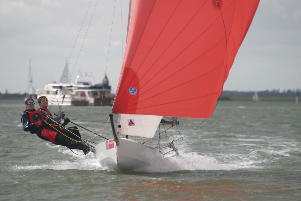 The next race saw Brellisford/Ash, Lennon/McKenna and Massey/Nurton arriving at the top mark together. Lennon/McKenna and Massey/Nurton involved themselves with a small passing yacht and Brellisford/Ash sped off never to be touched again. Lennon/McKenna suddenly disappeared off the course. Simpson/Hillary and Partington/Vernieres came steaming upwind, easily passing Archie Massey. They continued on to take second and with it second overall on count back.