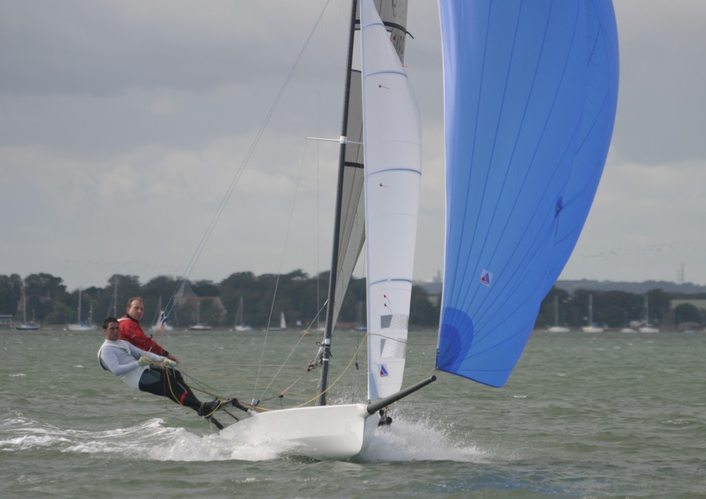 On the way back to Hayling from channel, Brellisford/Ash showed their superior knowledge of the marks within Chichester Harbour and nipped inside Duchesne/Cooper who were struggling to find the next buoy. Duchesne/Cooper then picked up what can only be described as a bale of straw on their rudder down the run and had to capsize to untangle allowing Simpson/Hillary & Massey/Nurton to come through into second and third. The wind was now up to it's 33 knot peak and the final run back to the Itchenor line saw Simpson/Hillary tip it in on the final gybe allowing Massey/Nurton through into second but Duchesne Cooper were too far back to capitalise and had to settle for fourth.