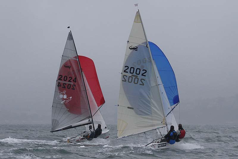 Despite the bleak outlook, 50 boats took to the water to be greeted by winds which were lighter than expected and so light at one point that it led to a delayed start. Lolling around on the sea without much wind clearly wasn't to everyone's liking as Max Hayman and Rachel Rhodes were both seen giving the fish a sample of last night's bar consumption. When the wind came back it steadily rose to 10-12 knots. First round the windward mark were John Mursell and Nick Keast (2020) showing a welcome return to form right at the end of the week, followed by Dave Wade and Ben Rayner (2026) and Tim Parsons and Alex Hayman (2014). The conditions took a decided turn for the worse on lap 2 with now driving rain and the RO decided to shorten at the end of the second triangle, much to most people's relief. The leading three held their positions and were followed in procession by Pete Gray and Richard Pepperdine (2013), Tom Jeffcoate and Hillary Harvey (2025) and Tom Castle and Tim Hartley (2022).