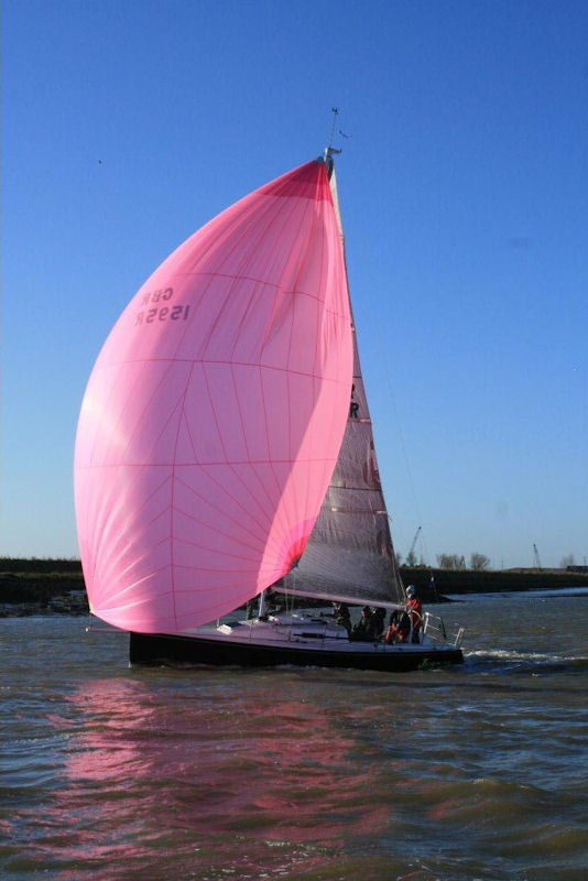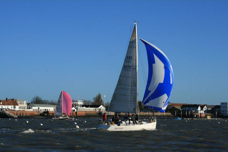 The annual New Year's Day race from the Royal Burnham Yacht Club took place today, in bright sunshine and a fresh westerly wind on a flood tide. The course took the four IRC yachts up and down the river in front of the Club. They had an upriver windward start to Number 11 before running downwind to Number 1, and then Number 13, Number 3, Number 13 before being shortened by Commodore and Race Officer Chris Slatter.