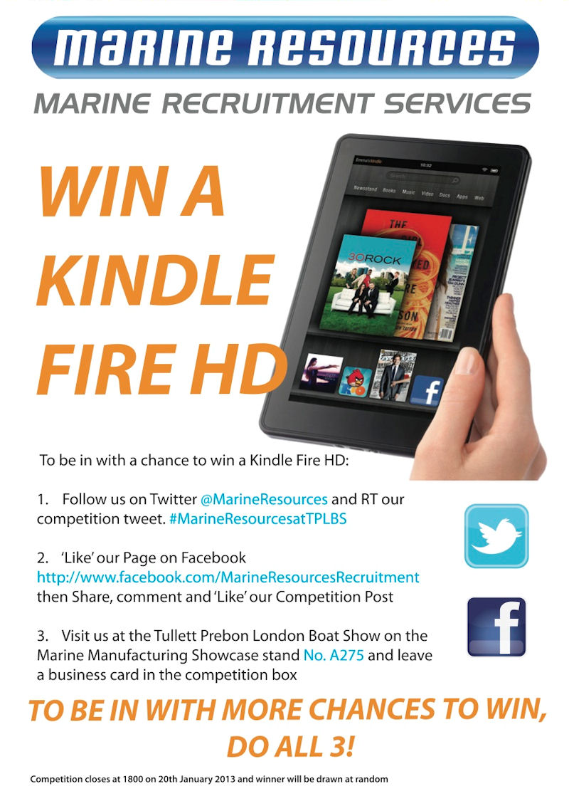 Hope you had a great Christmas break and are now feeling refreshed and ready to tackle the challenges of 2013. To celebrate our first year exhibiting at Tullet Prebon London Boat Show as part of the Marine Manufacturing Showcase on Stand A275 we are running a competition to win a Kindle Fire HD.
