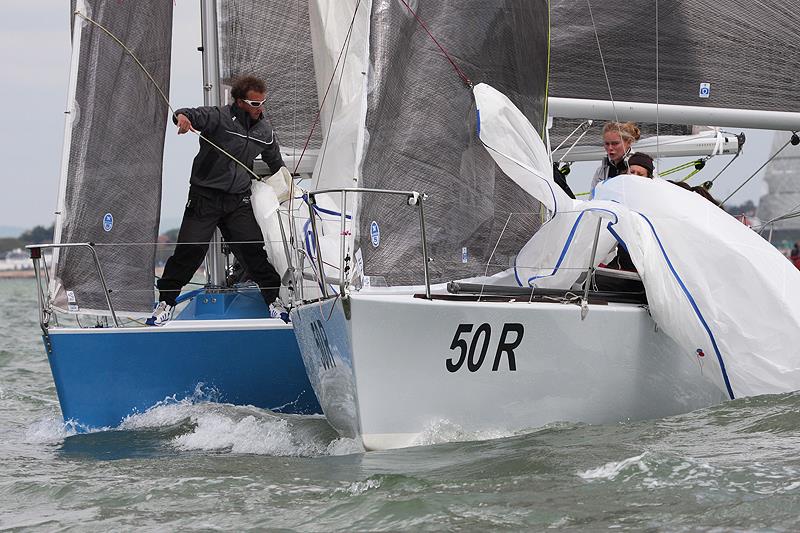 What the fleets on the small boat course lack in size they more than make up for in numbers. Class 4 featured thirteen J/109s with a different winner for each of their three races. First to show was David Richard's Jumping Jellyfish who claimed race one and went on to add a third and a fourth to their scoreline to take the overall lead with eight points. Andy Johns and David Rolfe's Shadowfax got her regatta off to a slightly wobbly start with a seventh place but won race two and took third in race three to claim second place overall on eleven points. Just one point behind them is Steve and Jody Maine's J2eau who won the final race of the day.