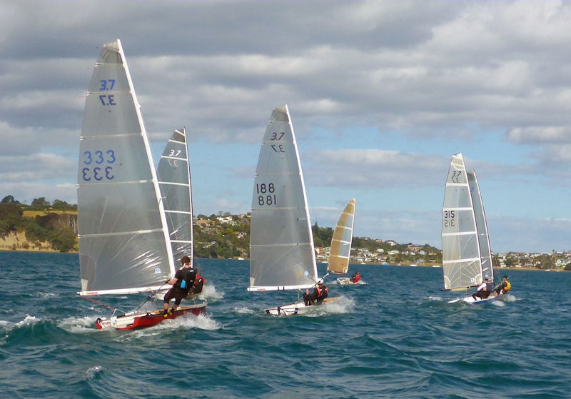 Carey Shelley (Richmond YC) won the under 21 division and placed 4th overall. Youngest sailor was Hamish Hall-Smith (French Bay YC), 15yrs old, in his first regatta sailing in the class since graduating from Starlings. A number of well-known names kept the sailing to a very high level including Don Wright (RNZYS) one of Sir Peter Blake's crew from multiple round the world exploits; ex-Great Britain sailing rep Oliver Hawkley (Manly SC) placed 5th overall; there was multiple 3.7 champion Lance O'Connell from Rotorua, and sailing dinghy legend Peter Sharp (BoIYC). The oldest competitor was David Cook (69) from Wellington. Multiple 3.7 Champ Mark O'Brien who is currently the fastest in a breeze (and way ahead on Grand Prix points this season), freely assisted many of the sailors with tips and advice, helping support beginners, and in fact anyone who wanted help.