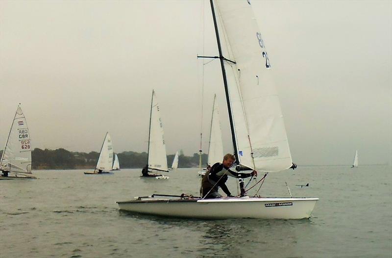 The wind sort of appeared out by the committee boat, but with North Easterlies at Weston the beats were always going to be tricky, shifty and gusty, and with the top Mark under the old Abbey, under the trees, the beat did or didn't fail to disappoint. Rob Angus kindly agreed to step in for Mike Murley, the overnight leader as Mike was off to Reading to drop his kids at Uni, maybe the pressure of the open was too much as I'm sure he could have got out of the trip if he'd tried... anyway, nice to see Rob albeit briefly as, after a good showing in race 3 I noticed him looking confused drifting around the windward mark looking at his rudder and was never seen again....
