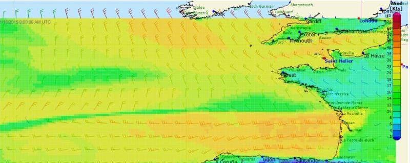 Collier Wakefield describes the weather scenario: "This departure takes into account more favourable conditions with a shift in the breeze to the north west, we should have about 15-20 knots, a good angle to get out of the English Channel and past Ushant. The breeze is due to build later on to 35 knots and we really want to stay just in front of that all the way down, which will mean sailing the boat to about 80% of its capability until we reach Cape Finisterre. Once we make the Portuguese coast, the weather should settle down considerably with the depressions passing north over the top of us so we should have a fast downwind ride to Lanzarote.