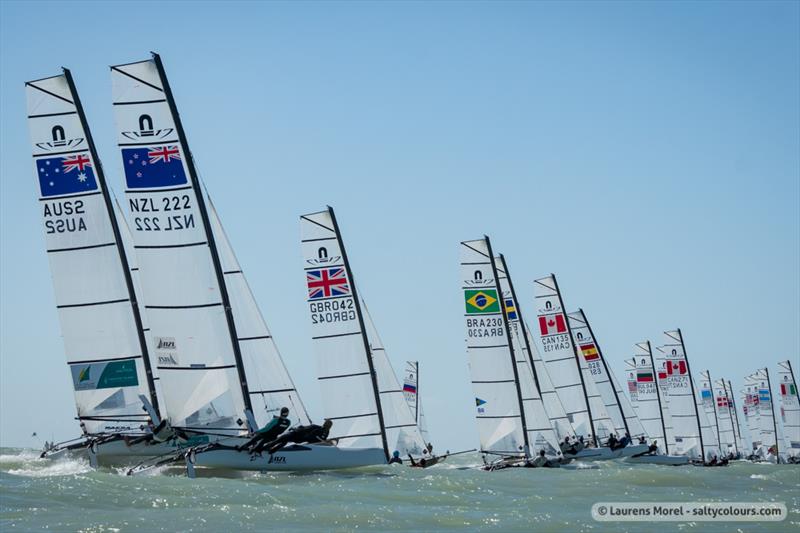 Other sailors that showed bursts of pace in the big breeze included the Italians, Vittorio Bissaro and Silvia Sicouri, who won the last race of the day, and Tom Phipps and Nicola Boniface from Great Britain who won the second race of the day, even if they didn't know it at the time. "It was very close at the finish, and we thought the Argentineans crossed the line before us," said Boniface, grinning after her first ever race win in a World Championship. "Always good to win a race, makes you smile!" The winning strategy was simple enough. "We went fast in the right direction and protected on the other boats. Today was quite a lot about boatspeed, if you went fast and got around the course safely you were going to do pretty well."