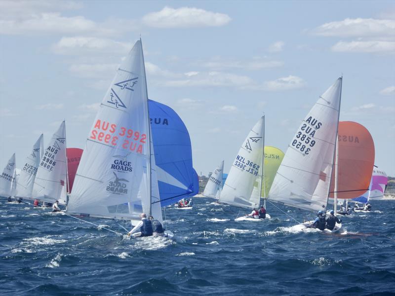 76 Flying Fifteens from 6 countries left Fremantle Sailing Club for the first two races of the 2023 Flying Fifteen Worlds Championship held off Fremantle under cloudless skies.