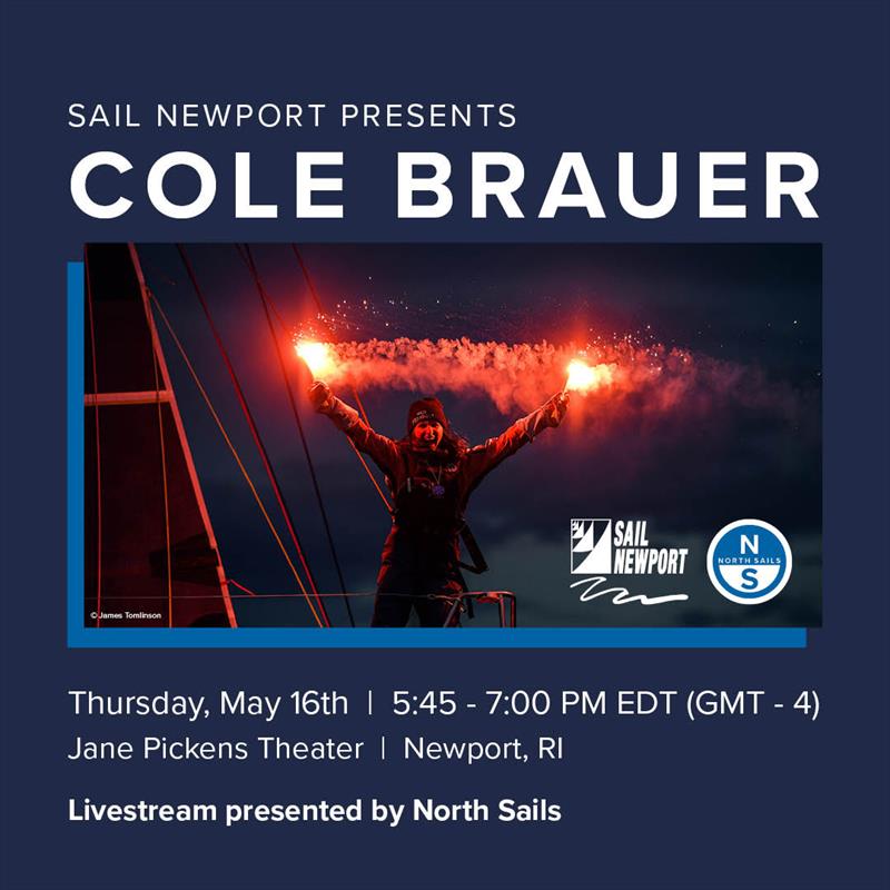 After two live shows sold out in a matter of hours, Sail Newport will now livestream The Cole Brauer event on Thursday, May 16, from 5:45 p.m. to 7:00 p.m. (EST) (GMT-4) courtesy of North Sails.