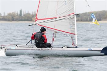 Once the wind direction had settled, the Race Officer set a triangular course in a patchy Force 2 breeze. This time the Catapults went for a more conservative starboard tack start, but found themselves almost becalmed by the Committee Boat watching helplessly as the bulk of the fleet found pressure at the pin end just 70 metres away. Eventually they got going but had to pick their way through the other boats. On lap 2 Gareth sailed into a header and lull as he approached the windward mark, allowing John and Stuart to catch up. The gap widened over the next lap, only for more wind to come down the course that enabled John and Stuart to enjoy a couple of fast reaches and close the gap again, so much so that John was right on Gareth's tail at the final mark. However, Gareth held on to finish just 20 seconds ahead of John and a minute ahead of Stuart.