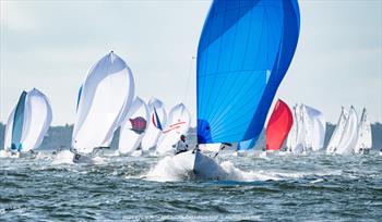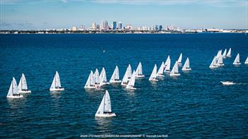 After a brief postponement to reset the line, race eight was off with many on port tack right after the start. As boats turned downwind, a parade of spinnakers lit up the left side of the course. Cate Muller-Terhune's Casting Couch (USA) earned the victory, ahead of Nuno Espirito Santo Silva's Bábá (POR) and Guillermo Parada's Nildo (ARG).