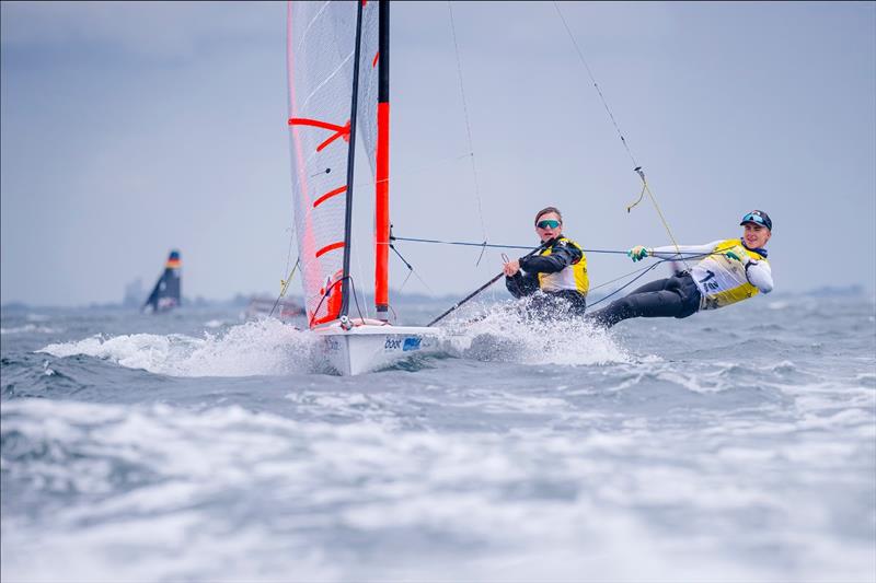 A strong performance by the 2025 World Champions Nicklas Holt and Philip Forslund, securing the 29er title at Kieler Woche 2025 © Sascha Klahn