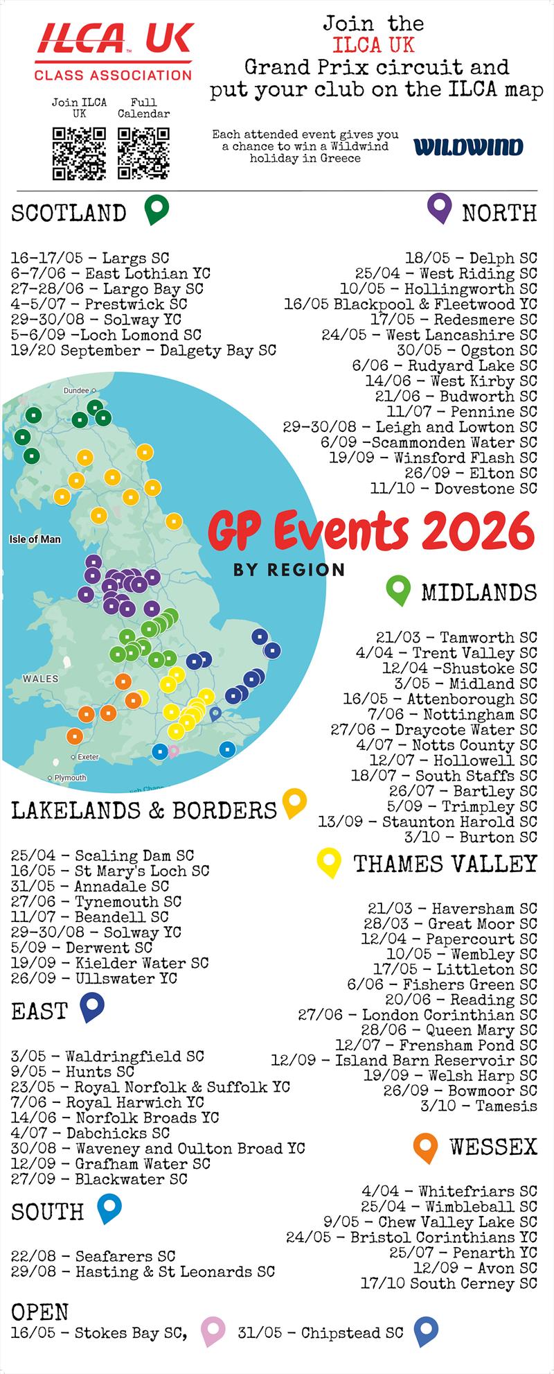 Underneath our National events, ILCA UK has the Grand Prix events run by local sailing clubs around the various regions of the UK. To date over 75 events have signed up as Grand Prix events in 2026 so there will definitely be an ILCA open locally that any sailor in the UK can get to relatively easily. One lucky participant will win a free Wildwind holiday in 2026.