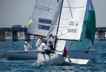 Sunday saw slightly less wind overall but with bigger differences in the highs and lows, covering was critical as a small split on the beat could, and did, result in lead changes. Hamish Taylor continued his winning ways from day 1 and finished the second round robin still undefeated. The fight for the remaing Semi-final places was tight with four teams all within reach of those places.