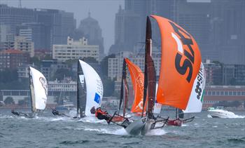 Race 2 of the JJ Giltinan 18ft Skiff World Championship, presented by The Winning Group, on Sydney Harbour yesterday (Sunday, March 8) was a wild day for the 27-boat fleet which battled incredible conditions ranging from a start in 20-plus knots of Southerly wind to finishing in blindingly heavy rain and no wind for the winner, Yandoo.