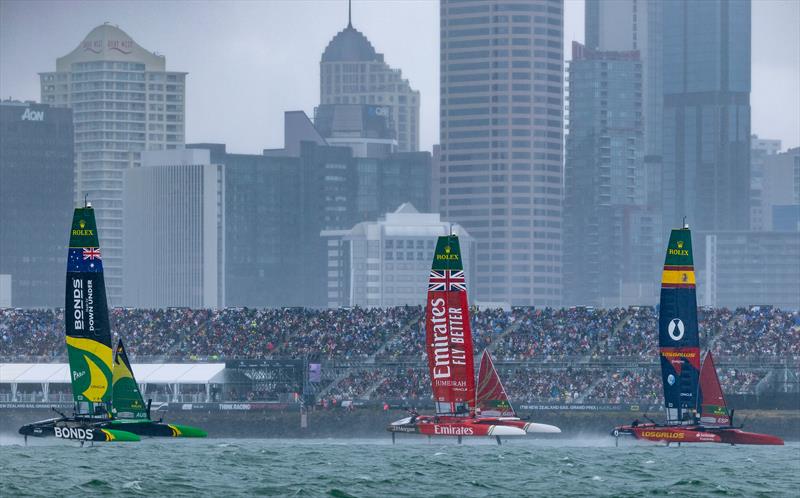 The last waltz? F50s race past the grandstand during the final race on Race Day 2 of the ITM New Zealand Sail Grand Prix in Auckland, Sunday 15 February . Rolex SailGP Championship Event 2 Season © Simon Bruty/SailGP