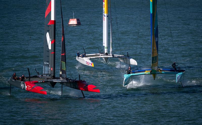 Switzerland SailGP Team helmed by Sebastien Schneiter leads Mubadala Brazil SailGP Team helmed by Martine Grael and Red Bull Italy SailGP Team helmed by Ruggero Tita during a practice session ahead of the DP World Spain Sail Grand Prix © Jason Ludlow for SailGP